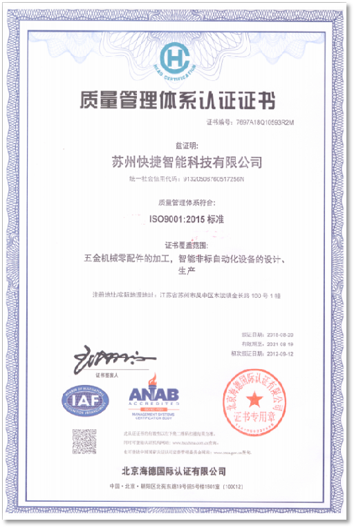 截止2025年,快捷智能已榮獲國家高新技術企業(yè)、科技型中小企業(yè)、瞪羚企業(yè)、專精特新中小企業(yè)、企業(yè)技術中心等多項榮譽,通過質(zhì)量管理體系認證等多項企業(yè)和產(chǎn)品認證。